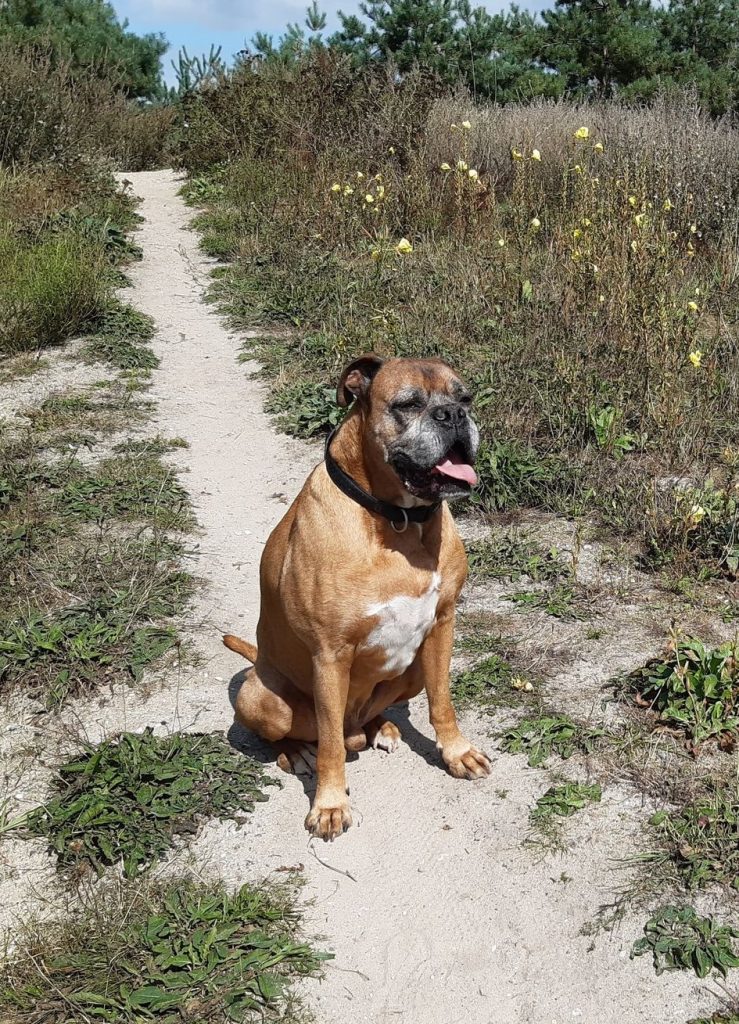 Halverwege maart hebben we Lexie (4 ½) en halfbroer Dodge (5 ½) geadopteerd. Een dubbele verrassing, aangezien we eigenlijk maar op zoek waren naar één boxer. In het begin was het een beetje afwachten of hun nieuwe thuis hen zou bevallen, maar ze voelden zich als team heel snel op hun gemak. De aankomst van onze nieuwe boxers viel gelukkige samen met de eerste lockdown (BE). Hierdoor was iedereen thuis en genoten we van elkaars gezelschap. Het was een nieuwe ervaring om ze allebei uit te laten. Samen goed voor zo’n 75 kilo en in nieuwe omgevingen werden we dus vaak in verschillende richtingen getrokken. Al snel werd duidelijk dat Lexie – zelfs na korte wandelingen – met haar linker achterbeen worstelde. Na verschillende bezoeken bij de dierenarts (röntgenfoto’s etc.) bleek dat haar kruisbanden aan beide achterpoten gescheurd waren. Vervolgens werd de beslissing genomen om een dubbele TPLO-operatie uit te voeren, niet de gemakkelijkste optie voor iedereen, maar na het lezen van een aantal ‘succesverhalen’ op boxergeluk waren we het eens dat dit op lange termijn de beste optie zou zijn. Na de operatie moest Dodge wennen aan solo wandelingen en Lexie bracht enkele weken door in haar bench om te herstellen. Gelukkig waren de operatie en het herstel een groot succes en bleef Lexie sterker worden – nu is ze niet meer te stoppen! Tijdens haar herstel begonnen we echt een hele hechte band met Dodge te voelen, hij werd onze ‘gentle giant’ of zachtaardige reus. Dodge had veel haarverlies dat werd verergerd door een soort irritatie in zijn nek waar hij eindeloos aan kon blijven krabben. Helaas had Dodge in deze periode ook enkele momenten waarop hij na het spelen (of een intense activiteit) gewoon neerviel en 15 seconden niet zichzelf was. Dit gebeurde maar een paar keer, maar het was genoeg om ons herhaaldelijk naar de dierenarts te sturen om een ‘genezing’ voor de allergie/irritatie te zoeken en om te achterhalen wat hem zo uitputte na het spelen. Buiten zijn irritatie leek Dodge zijn gezondheid zeer goed. Tijdens de zomer hadden we geweldige momenten met hen beiden, ze waren onafscheidelijk en vonden duidelijk veel troost in elkaars gezelschap. Het was echter in augustus dat het met Dodge slechter werd. Op een avond tijdens een wandeling begon hij kleine hoeveelheden bloed op te hoesten. Na verschillende röntgenfoto’s bij de dierenarts bleek dat hij een hersentumor had die zich al diep in zijn longen had verspreid. Alle hulp kwam dus helaas te laat… Slechts een paar weken later, op de laatste dag van augustus, moesten we van onze lieve Dodge afscheid nemen. Hij was iets meer dan vijf maanden bij ons en maakte een blijvende indruk op ons allemaal. Plots hadden we terug maar één boxer en bleef Lexie alleen over zonder Dodge – haar broer, bodyguard, (slaap)kussen en speelkameraad. Met een bang hartje was het afwachten hoe Lexie hier op zou reageren, maar al snel zorgde ze voor plezier en warmte om ons te troosten. Ondertussen zijn we een halfjaar verder en is Lexie een fantastische gezinshond geworden. We genieten er ontzettend hard van om lange wandelingen te maken en andere honden en mensen te ontmoeten. Alhoewel Lexie voor dat laatste nog wel heel bang is. We kijken uit naar nog veel gelukkige jaren samen met ons Lexie en koesteren alle mooie herinneringen van onze gentle giant Dodge